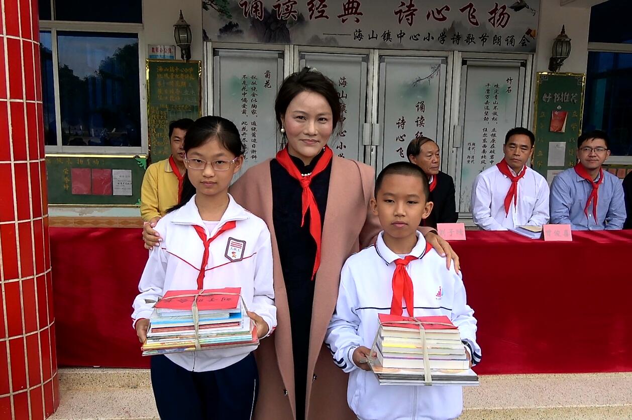据悉,海山镇教育促进会会长刘子晴本学期来深入海山各学校,关心家乡孩子的学习及生活情况。当了解到海山镇中心小学本部多次开展读书节活动,孩子们渴望阅读高品质的图书时,她依照孩子们提供的“最喜欢的图书”书单,精心购买了图书一批,共计8000余册,赠送给海山镇14所小学的孩子们。