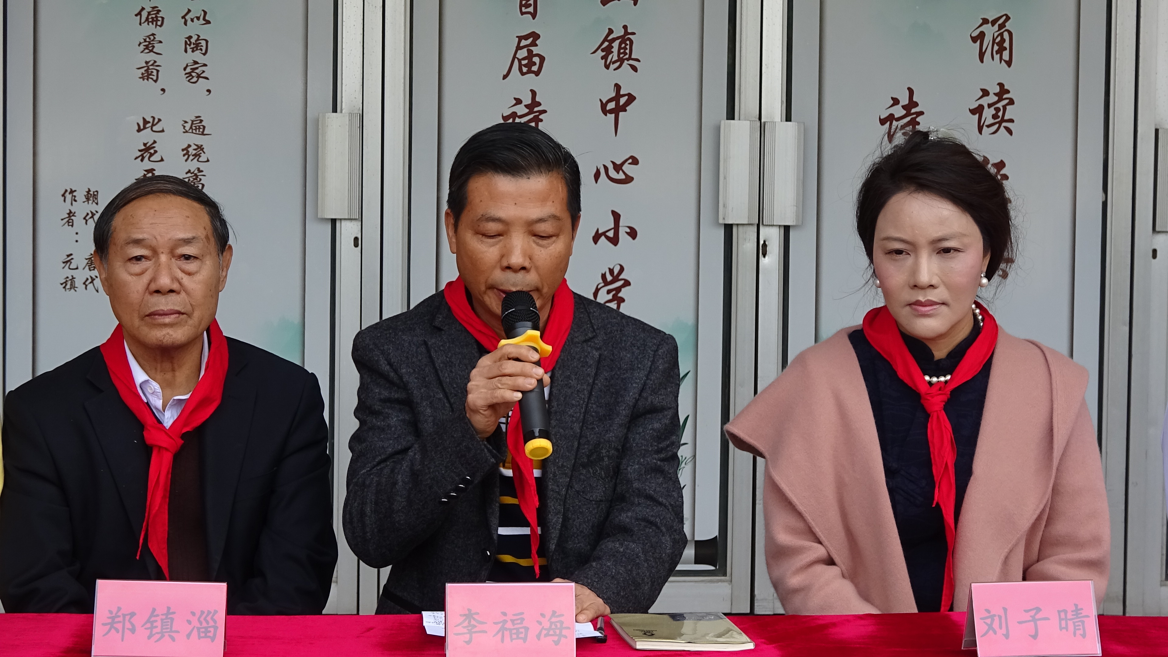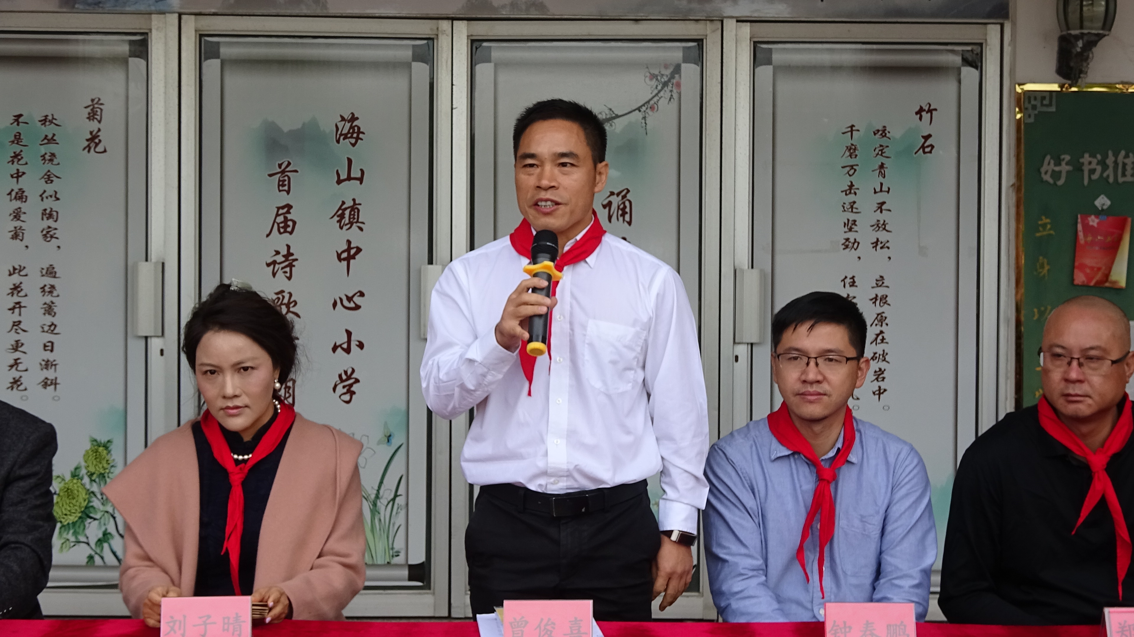 海山镇中心小学校长李福海致辞,向海山镇教促会以及关心支持海山教育的各级领导表示感谢,并鼓励孩子们珍惜时光、努力学习。