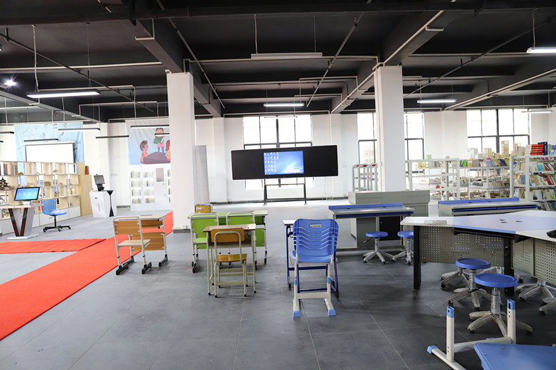 协会会长、党总支书记聂道良向李会长和黄会长等参观介绍了协会里的创客空间、卡魅实验室、智慧图书馆、纸电联合自助借还书机、微型图书馆、智慧黑板、电子班牌、学生电脑台、学生课桌等一系列智能科技创新文化教育产品。
